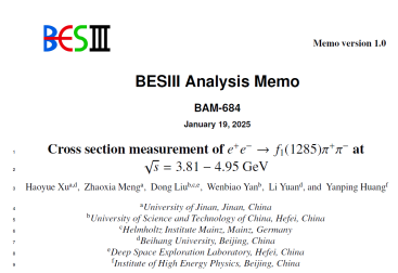 近日,粒子物理团队在BESIII实验数据分析领域取得重要进展,相关研究发表在知名期刊《Physical Review D》上,题为“Cross section measurement of e^+ e^- à f_1(1285) pi^+ pi^- at center-of-mass energies between 3.808 and 4.951 GeV”(//doi.org/10.1103/567d-cv9k)。粒子物理实验论文需要整个合作组的共同努力,根据国际惯例,粒子物理实验方向发表的论文作者按姓氏字母排序,因此没有传统的第一作者、通讯作者。一篇论文的实际具体工作通常为合作组内多家单位合作研究,本文由济南大学、中国科学技术大学、德国美因茨亥姆霍兹研究所、北京航空航天大学及中国科学院高能物理研究所合作完成,我院研究生许皓月(现于北京航空航天大学博士在读)为实际第一作者,我院孟召霞副教授为指导教师。